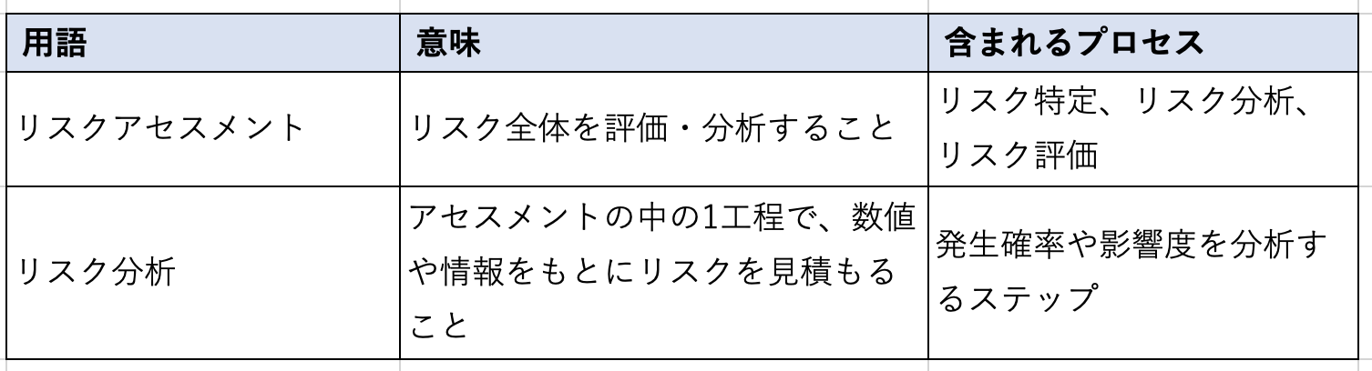 「リスクアセスメント」という言葉もよく耳にしますが、リスク分析とは少し意味が異なります。