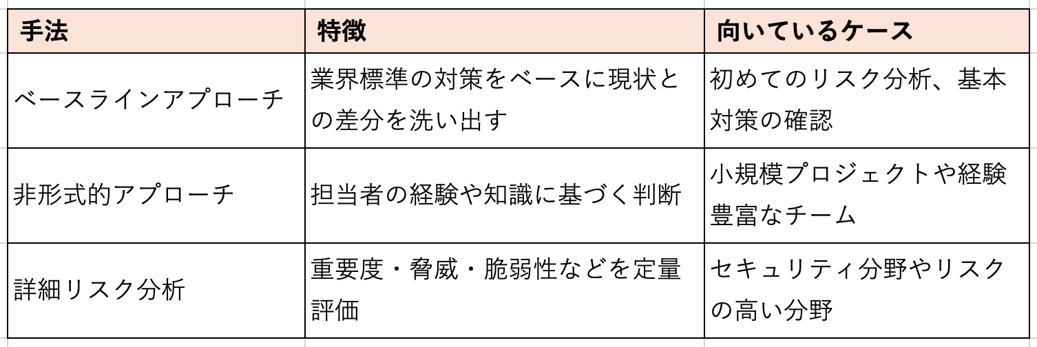 このように、「何を守りたいのか?」「どんな事態が起こりうるのか?」を起点に考えることが、手法選定の第一歩です。