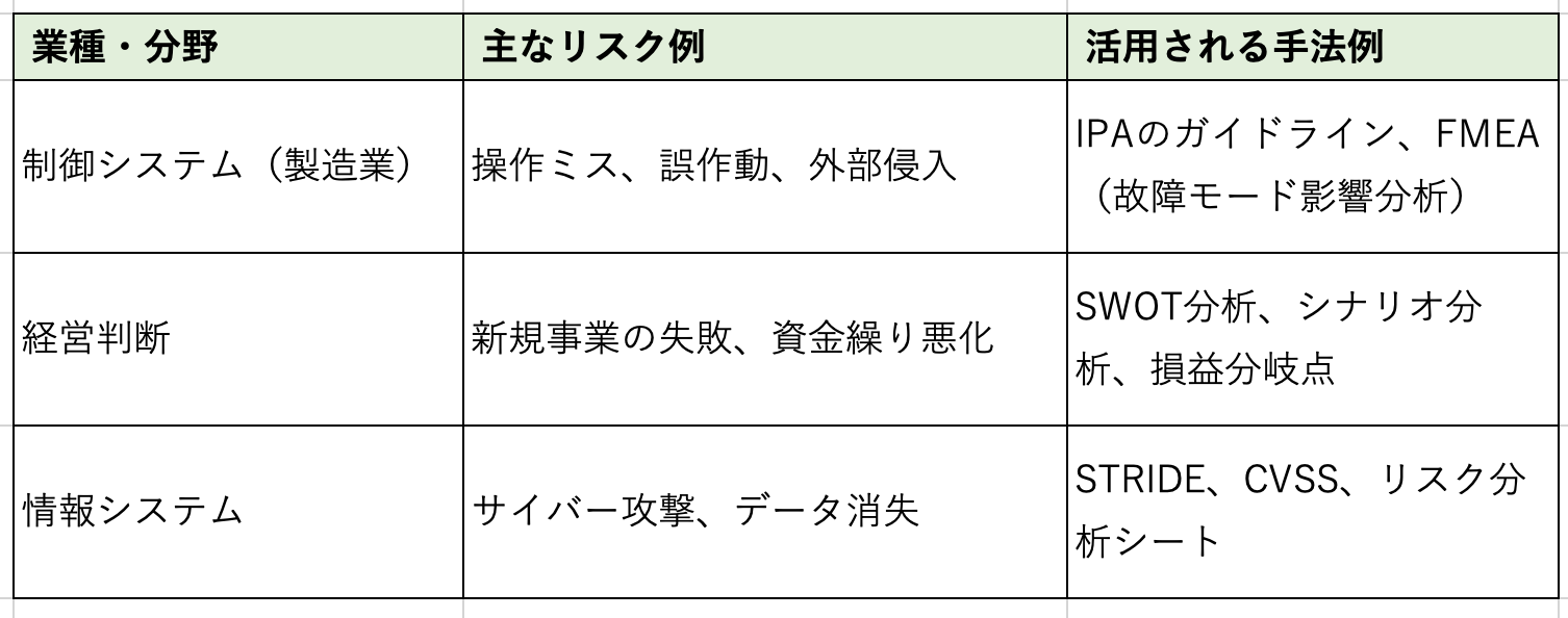 リスク分析は、業種を問わず様々な分野で活用されています。代表的な例を挙げると:
