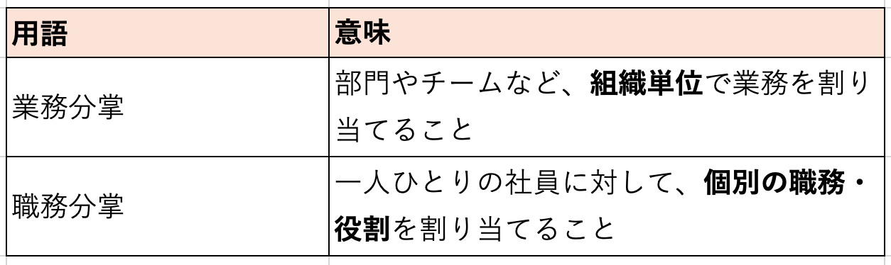 「職務分掌(しょくむぶんしょう)」も似た言葉ですが、意味には微妙な違いがあります。
