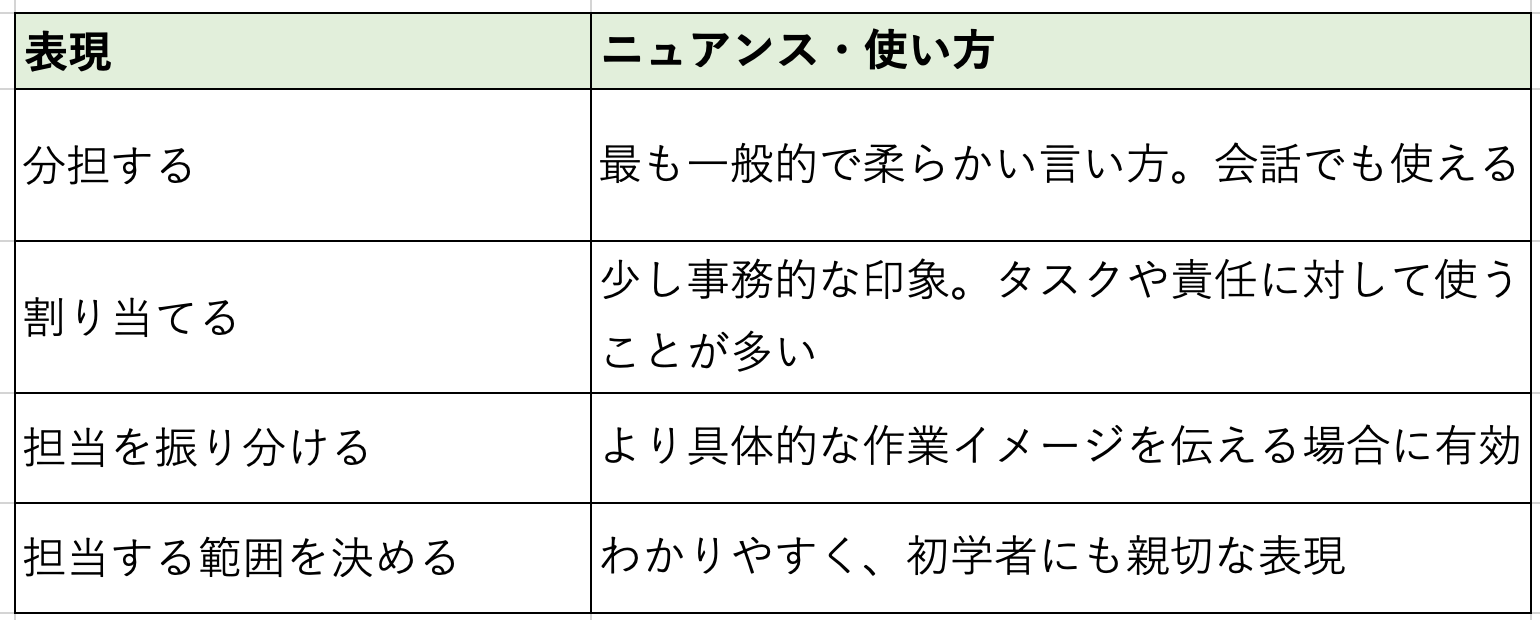 ただし、少し硬い表現なので、口頭では「役割を決める」「担当を振り分ける」などの言い換えを使うこともあります。